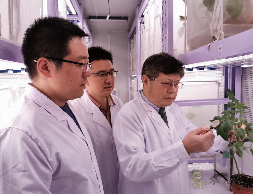 文章通訊作者張友軍研究員(右一)和第一作者夏吉星副研究員(右二)、郭兆將研究員(右三)在實驗室觀察番茄上煙粉虱的實驗情況 圖片由采訪對象提供
